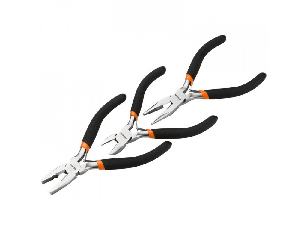 Každý nástroj v sade má dĺžku 115mm, čo zaisťuje skvelú ovládateľnosť a precíznosť pri práci v malých priestoroch. Kliešte sú vyrobené z kvalitnej chróm-vanádiovej (CrV) ocele a sú poniklované pre zvýšenú odolnosť a dlhodobú výdrž.